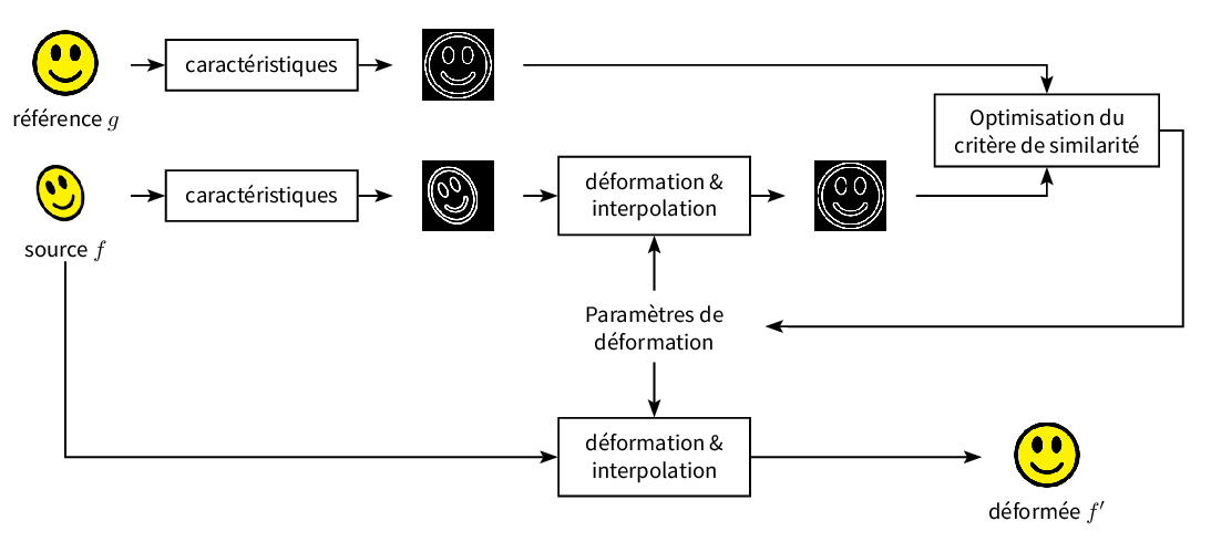 La déformation à appliquer sur l’image source est basée sur des caractéristiques de cette image. Le choix des caractéristiques utilisées conduit à l’une des deux méthodes de recalage décrite ci-après.