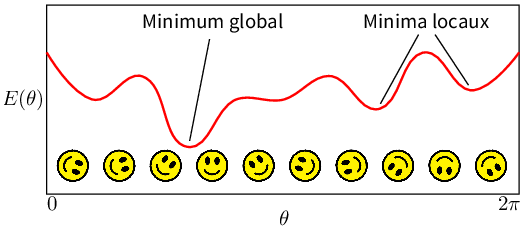 Fig. 69 Principe de l’optimisation d’un critère \(E\) : exemple pour \(\theta=\alpha\) dans le cas d’une simple rotation.#